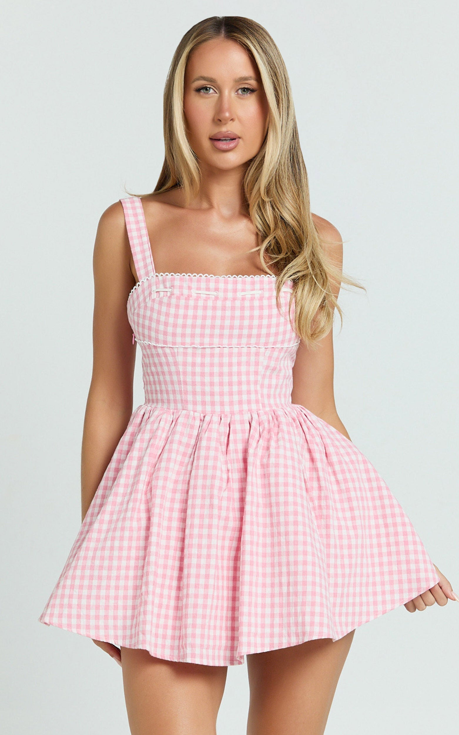 Elevate your style with our Caitlin Mini Dress - a show-stopping gingham square neck fit and flare dress in the most delightful shade of pink. Crafted from breathable cotton, this dress is not just about looking good; it's about feeling fantastic too. Perfect for those party days or any time you want to stand out, the Caitlin Mini Dress is the piece you've been searching for.