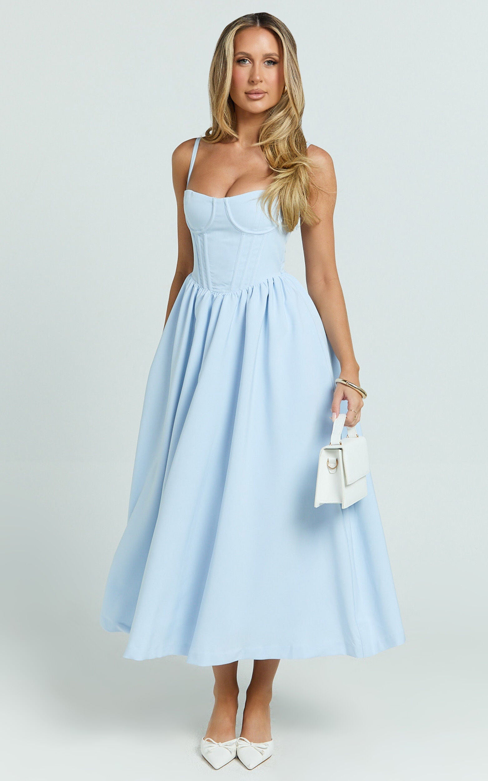 Discover the perfect look in our Nadine Midi Dress, a masterpiece that encapsulates allure and elegance in shades of baby blue. This fit & flare silhouette is designed to embrace and celebrate every body type, ensuring you feel as unstoppable and fabulous as you truly are. Exuding the quintessential blend of modern fashion and timeless grace, it's an epitome of empowerment stitched into every seam.