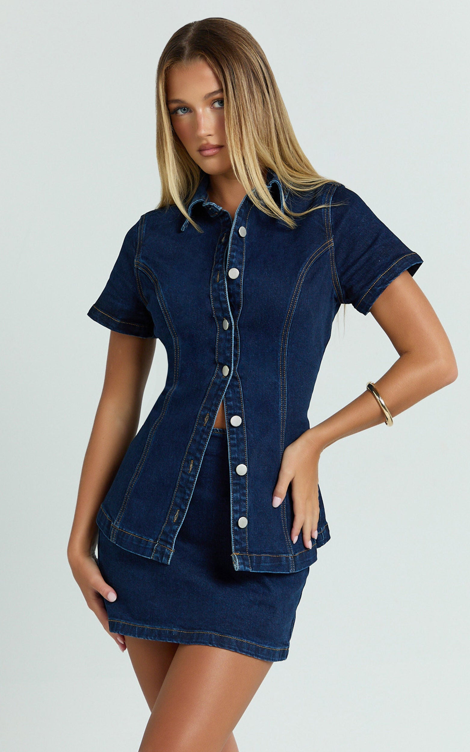 Transform your look with the Paige Top �C a standout piece that redefines casual chic in a dark blue wash. This button-down short sleeve denim top exudes effortless cool and versatility, blending the timeless appeal of denim with a fresh, modern silhouette. Crafted from top-quality cotton, it promises both comfort and durability, ensuring that it becomes a treasured part of your wardrobe for years to come.