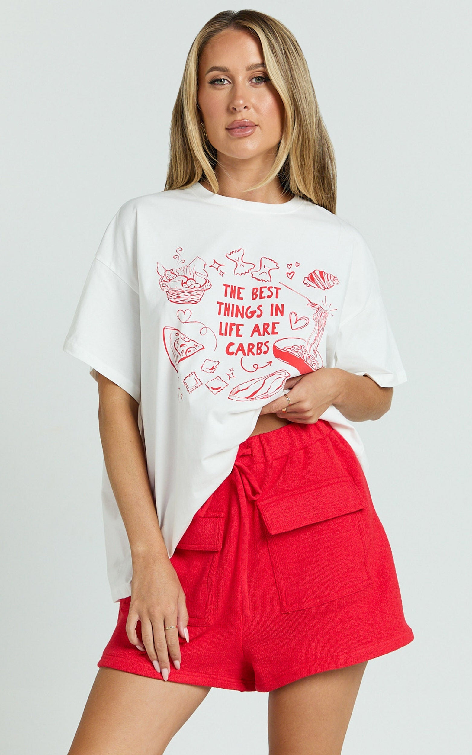Discover the perfect look in our Rheyna Top - an oversized, empowering piece that celebrates the best things in life with its playful The Best Things in Life Are Carbs print. Designed for the fashion-forward Gen Z and Millennial who loves to mix comfort with a statement, this white T-shirt is a must-have addition to your wardrobe.