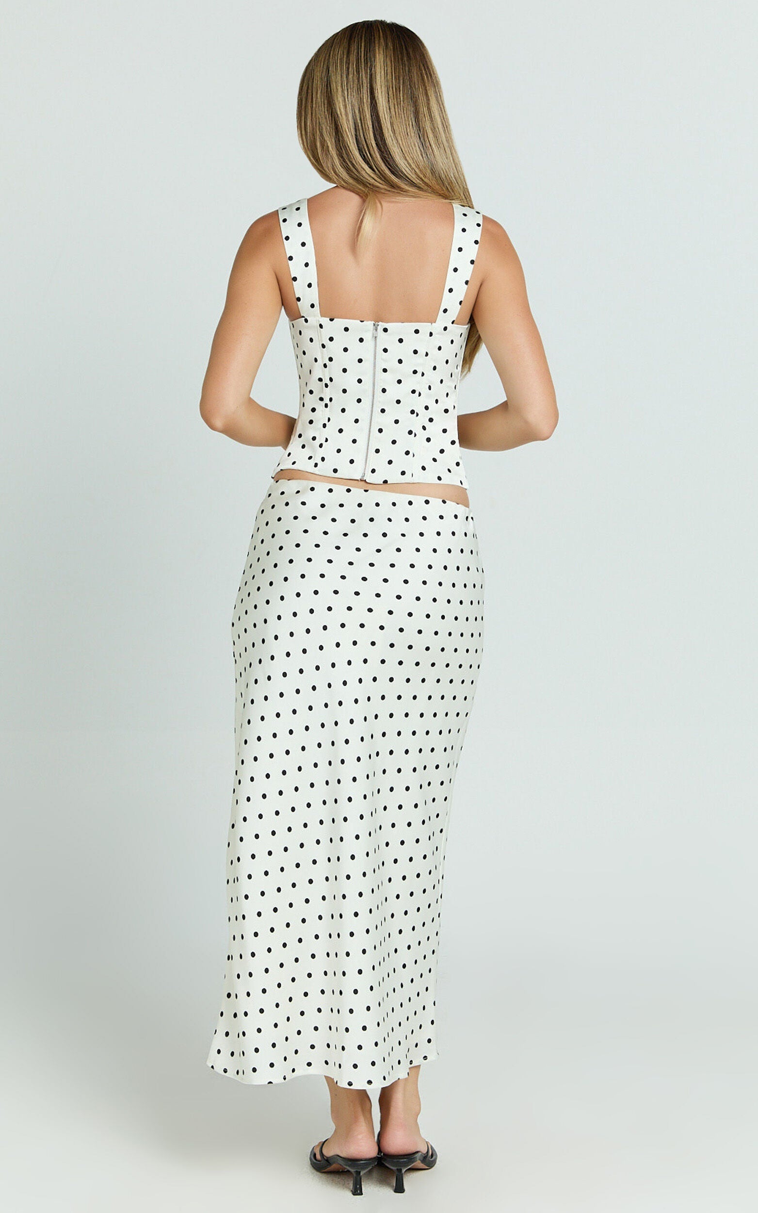 Make a statement in the Runaway The Label - Karlita Midi Skirt In White Polka, where fun meets fabulous in one swoosh of a skirt. This isn't just any skirt; it's your ticket to being the life of the party, the spark in every conversation, and the trendsetter everyone's eyes are glued to. Designed for the modern femme with a nod to playful yet sophisticated style, this white slip skirt dotted with charming polka dots is the ultimate must-have for your wardrobe.