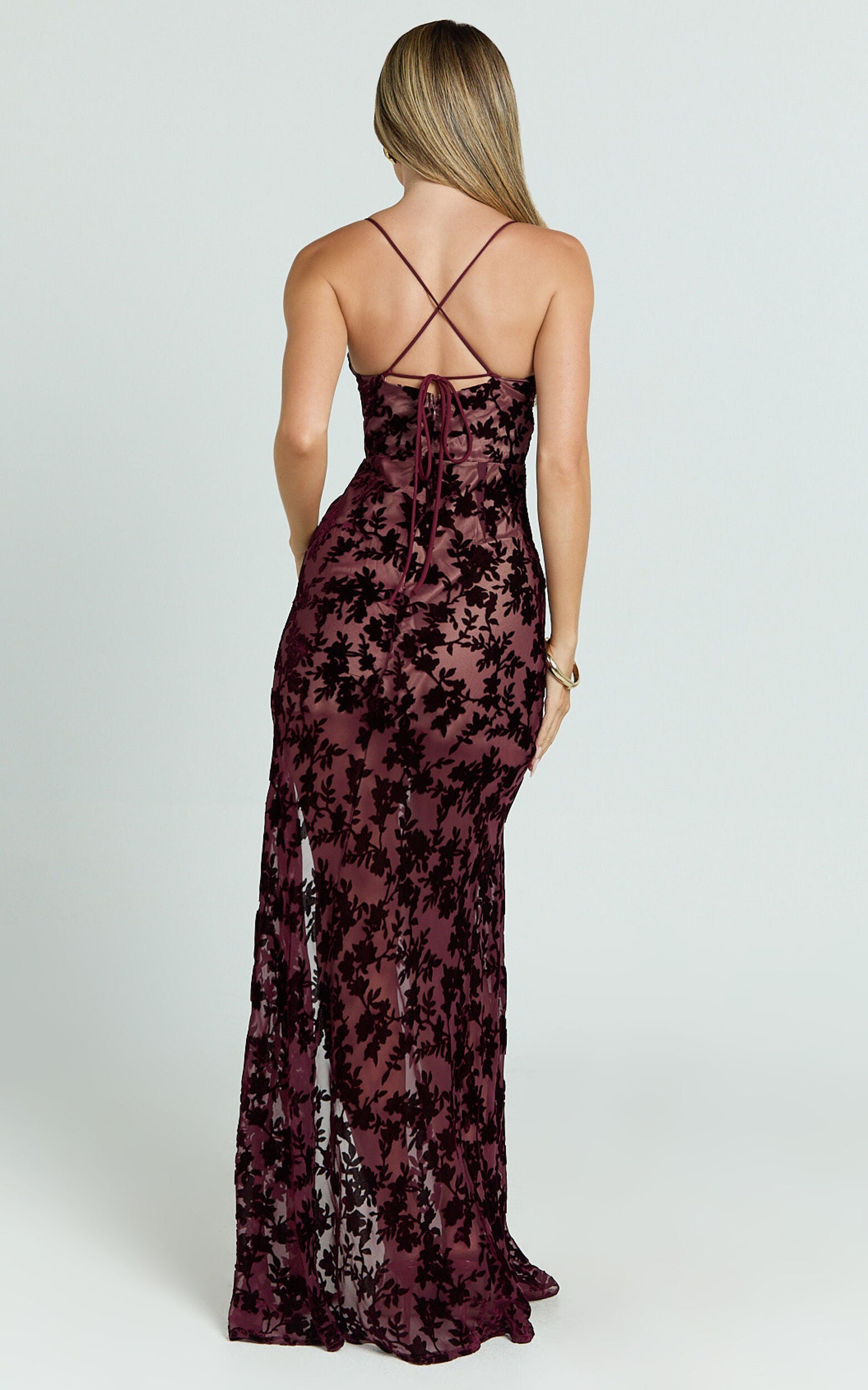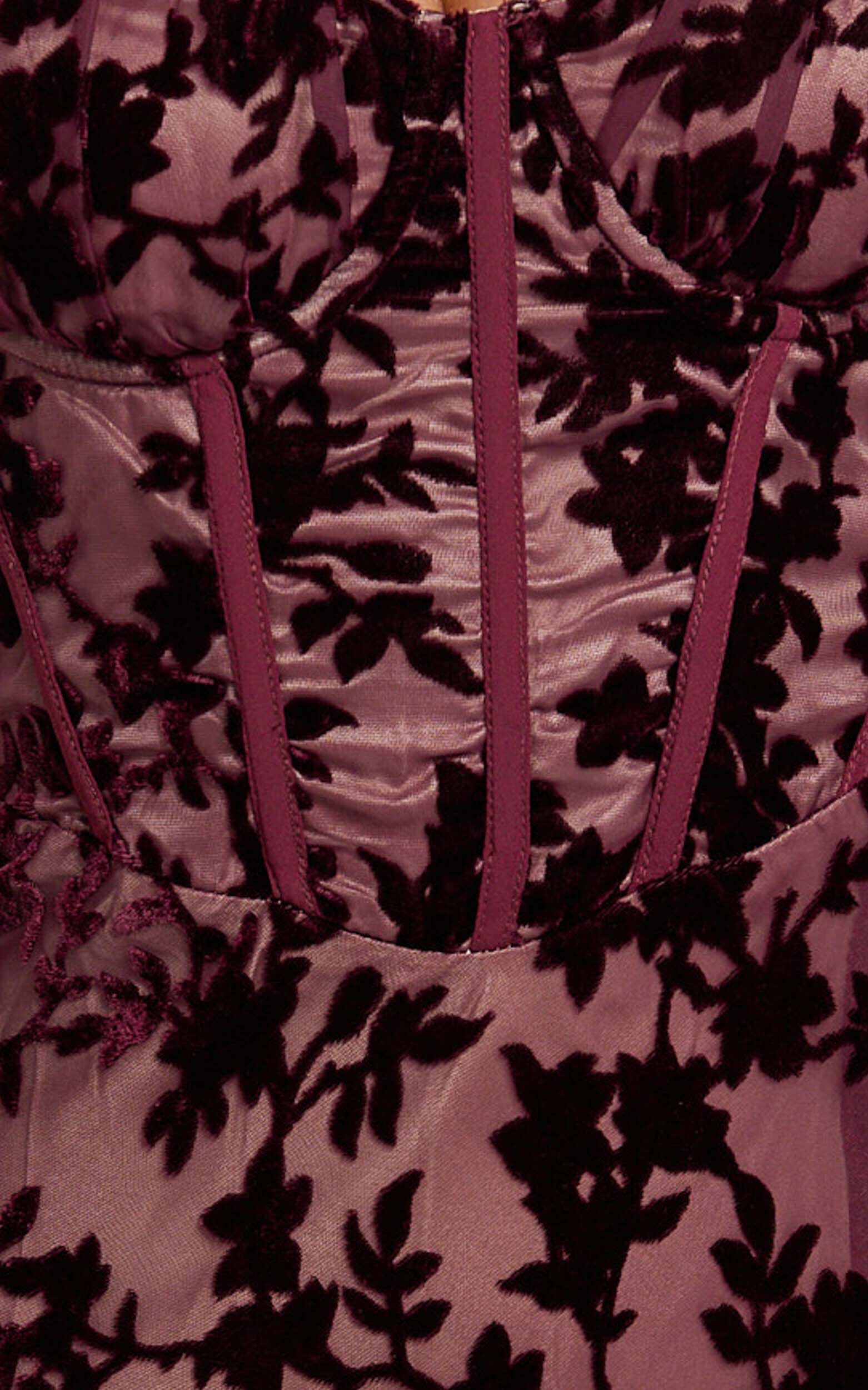 Step into a world where fashion meets empowerment with our mesmerizing Violeta Maxi Dress. This corset-front burnout dress, in an exquisite wine tone, is a timeless addition to your collection, perfect for those who love to make a statement. Whether you're searching for the ideal cocktail attire, a striking wedding guest ensemble, or simply want to dazzle at any event, the Violeta Maxi Dress is designed to make you feel confident and beautiful.